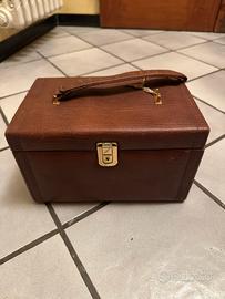 Beauty case vintage in pelle con alcuni utensili come pettine, spazzola, lustra scarpe e lucida scarpe. Chiave annessa e funzionante. Un lato del cinturino é scucito.