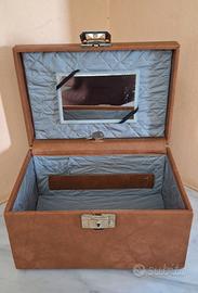 Beauty vintage rivestito in pelle marrone. Chiusura con chiave. Manico in metallo dorato. Foderato internamente in tessuto trapuntato grigio. Con specchietto rimovibile.