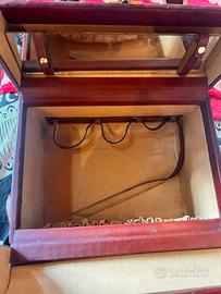 Beauty-case vintage in pelle vera, antico, foderato con uno scompartimento interno e specchio rimovibile, ha pochi segni di usura ma in generale in buone condizioni