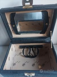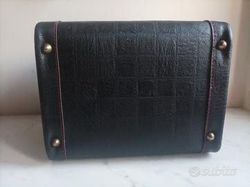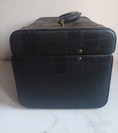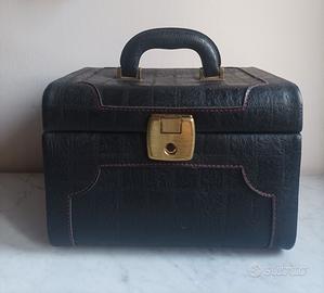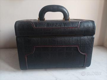 Beauty case Vintage, credo in pelle, nera con cuciture rosse. Specchio interno con cerniera, Si chiude con chiavetta. striscia interna per tenere dritte bottiglie di shampoo e profumi. Con piedini di base e manico che si abbassa. Ottime condizioni. non spedisco INPOST