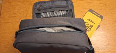 Beauty da viaggio compatto e leggero di Mandarina Duck linea Smile&go, con manico per appenderlo, tasche interna e sulla patella.
