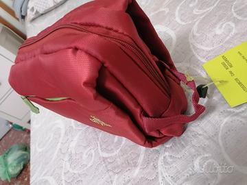 Materiale e caratteristiche:Sembra essere realizzato in un materiale sintetico e leggero, probabilmente in tessuto o nylon.È dotato di una piccola maniglia laterale.Le misure sono: 30 ×25×8-9 cm circa. Non si può misurare precisamente perché è un po' inbottito. Nuova con etichetta e logo sopra e dentro. Ha due tasche dentro e una esterna con lucchetto e le chiavi, con una cerniera di colore verde, come in foto.