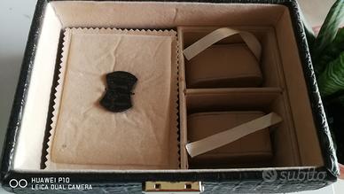 Vendo un beauty portagioie vintage in pelle pitonata marrone scuro in ottime condizioni con molti scomparti ben organizzati. È rivestito in panno vellutato con finiture in pelle. Misure 23x15x12h