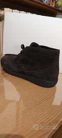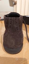 bellissimo polacchino da uomo in morbida pelle scamosciata testa di moro con allacciatura a 3 fori e con caratteristico disegno all'inglese a coda di rondine e microforellini. Suola di gomma. Come nuovo perché MAI USATO. Taglia 42