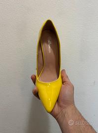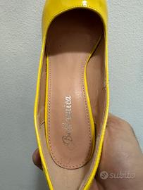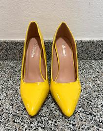 Décolleté Bellamica da donna in vernice lucida color giallo, modello elegante con punta affusolata e tacco largo stabile e comodo.