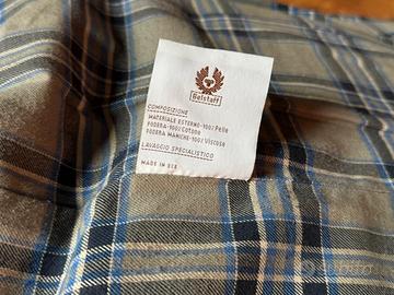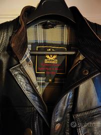 Giacca Belstaff originale in vera pella Taglia M Designed Made in England. Specifiche del capo: Pelle nera, senza strappi, tagli, fori o abrasioni. Esclusiva fodera a quadri in cotone, nelle maniche in viscosa. Chiusura anteriore mediante cerniera a lampo con doppio cursore, in metallo. Anteriormente quattro tasche a toppa con risvolti anti-pioggia, ciascuna chiusa con due bottoni automatici a pressione. Interno dei polsini e del collo in velluto a coste. Chiusura del collo rinforzata con cinturino in pelle e fibbia in metallo. Polsini dotati di chiusura, a due livelli, con cinturino e bottone a pressione. Toppe di protezione su spalle e gomiti. Mostrina esclusiva in metallo con logo Bellstaff sulla manica sinistra. Condizioni eccellenti pari al nuovo.