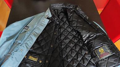 Giubbino Belstaff colore grigio/blu, taglia 44, completo di smanicato trapuntato nero, chiusura a zip doppio cursore piu bottoni, quattro tasche avanti, logo sulla tasca destra e manica sinistra, cintura alla vita, occhiello di areazione sotto manica.