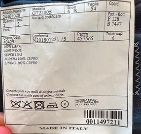 Giacca sartoriale maschile, Belvest, taglia 54: Corrisponde a una taglia italiana XXL, adatta generalmente a un torace di circa 106-110 cm e un'altezza tra 180 e 184 cm. Drop 6 R: Indica una vestibilità regolare (Drop 6) e una lunghezza standard (R per "Regular"). Un Drop 6 significa che la differenza tra la semicirconferenza del torace e quella della vita è di 6 cm, ideale per corporature medie. Tessuto e Materiali: 100% Lana Super 130 S: Il capo è realizzato in pura lana vergine di alta qualità. Il numero "Super 130s" indica la finezza della fibra (circa 17 micron): più alto è il numero, più il tessuto è sottile, morbido e pregiato. Fodera 100% Cupro: La fodera è in Cupro (conosciuto anche come Bemberg), una fibra naturale rigenerata derivata dal cotone. È un materiale molto apprezzato nell'alta sartoria perché è traspirante, setoso al tatto e antistatico. Istruzioni per la cura: Solo lavaggio a secco (simbolo del cerchio con la 'P'). Stiratura: Stirare a bassa temperatura (un solo pallino sul ferro). Divieti: Non candeggiare, non lavare in acqua e non asciugare in asciugatrice. L'etichetta riporta il codice modello (G72200S) e varianti codificate che corrisponde a brand Belvest.