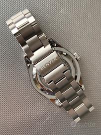 Orologio nuovo BENYAR Automatic 10 BAR ref. BY-5185M dotato di movimento meccanico automatico resistente all’acqua fino a 100 metri visibile attraverso il vetro del fondello a vista - dotato di tutto il suo corredo originario (come visibile il foto) - cassa di 39 mm di diametro - raffinato quadrante nero con indici applicati in rilievo - cristallo minerale - bracciale inox originale completo di tutte le maglie con la scritta BENYAR sulla chiusura adatto a polsi di qualsiasi dimensione