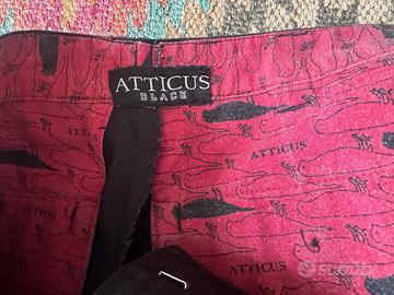 Pantaloncini shorts modello bermuda della Atticus Black, color nero. Un capo iconico per gli amanti dello stile skate, punk-rock e dei brand storici della scena alternativa. Punti forti: Design: Nero classico con l'inconfondibile logo Atticus (l'uccellino a testa in giù) su patch triangolare rossa cucita sul retro. Dettagli Interni: Fodera della vita e delle tasche in rosso acceso con pattern grafico Atticus a contrasto (molto bello da vedere anche se nascosto). Taglia: 48 Italiana (33 US). Materiale: Twill di cotone robusto. Condizioni: Il capo è in condizioni discrete/buone. Presenta i normali segni di usura dovuti al tempo, come un naturale e leggero scolorimento del nero (effetto vintage) e del pilling (piccoli pallini) sulla fodera interna rossa, che non ne pregiudicano l'utilizzo o l'estetica esterna. Prezzo ribassato per questi motivi. Misure (in piano): Vita: 42-43 cm circa. Spedizione rapida e imballaggio curato