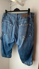 Pinocchietto/bermuda in denim, marca Take Two Upgrade Dept., colore blu jeans, taglia USA W34 (corrispondente a una 48 italiana), tasche frontali e laterali, con pratico laccio laterale porta-attrezzi (stile workwear/muratore), oggi molto usato come dettaglio moda streetwear, buono stato, usato ma ben tenuto; nella foto il pantalone è indossato da una persona alta 188 cm, per dare un’idea della vestibilità.