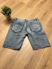Bermuda jeans in denim blu con strappi frontali e fondo sfrangiato.