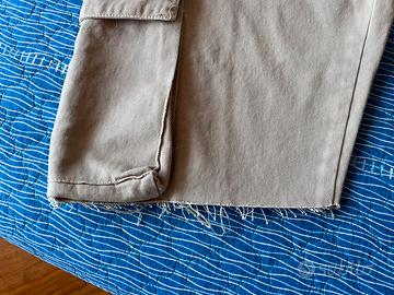 Bermuda molto sportivo con orlo sfrangiato e diverse tasche ampie, stile cargo. Mai indossato, solo tolta la targhetta per errore taglia. Il tessuto è di un bellissimo cotone sostenuto e spesso.