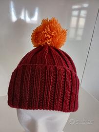 berretto da donna fatto a mano con filato di pura lana. è di colore bordeaux con un pon pon arancione. la pura lana è una garanzia per il calore e la morbidezza. può essere indossato come un classico berretto rivoltando molto il bordo, oppure in modo più morbido così da contenere i capelli.