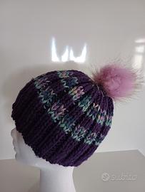 berretto da donna fatto a mano con filato di pura lana. presenta rigature di colore viola scuro e fantasia in tinta, il pon pon di colore rosa, effetto pelliccia, completa questo capo. è molto caldo, veste comodo e abbina benissimo abbigliamento casual ma anche elegante.