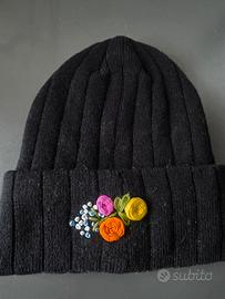 Vendo berretto nero brand "Mess" con isolamento termico 3M Thinsulate, personalizzato da me con un ricamo floreale realizzato interamente a mano.