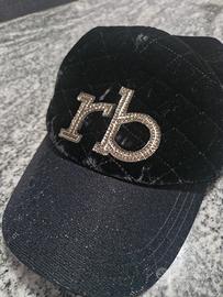 Berretto nero in velluto trapuntato con logo RB decorato con strass. - Tessuto in velluto. - Dettaglio logo RB con strass. - Visiera con finitura glitterata.