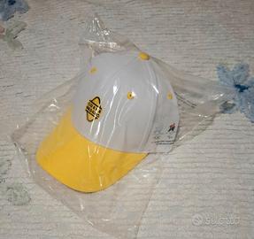 Berretto con visiera e Olimpiadi Milano Cortina by Grana Padano, taglia unica, unisex, bianco e finiture gialle, regolabile tramite velcro sul retro. Nuovo in confezione originale.
