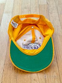 Il cappello è in velluto a coste giallo brillante, con logo viola. Prodotto dalla fu Twins Enterprise di Boston, l’azienda oggi nota come ‘47, così chiamata in onore dell’anno di fondazione da parte dei gemelli D’Angelo originari della provincia di Chieti, che per moltissimi anni furono i produttori di souvenir dei Red Sox. Oggi i gemelli sono passati a miglior vita, ma l’azienda produce ancora merch per tutti gli sport americani, anche per NFL, specializzandosi sempre in berretti. Il logo TWINS testimonia che si tratta di un cappello precedente il rebranding del 2010.
