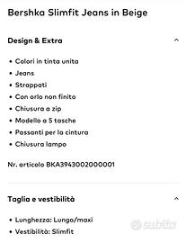 Vendo per inutilizzo pantalone da uomo Bershka Slimfit Jeans in Beige, acquistato nuovo a 29,99€ ma mai utilizzato. Taglia 34, nelle foto ulteriori dettagli. Possibile spedizione a carico dell’acquirente.