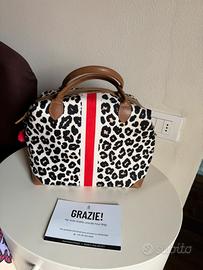 Corpo maculato, bande avorio/papavero, pelle cuoio naturale. Completa di tracolla abbinata originale staccabile; portabile a spalla o a mano. Borsa resistente, capiente, leggera e lavabile. Apri i gemelli e diventa una shopping, oppure chiudi i gemelli e mantiene la sua forma più classica.