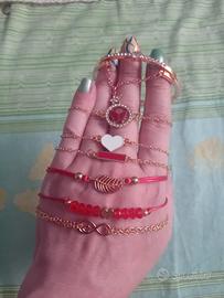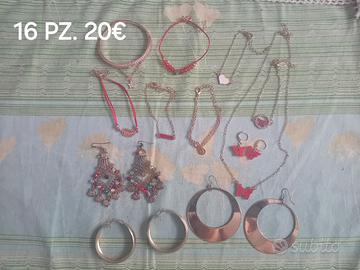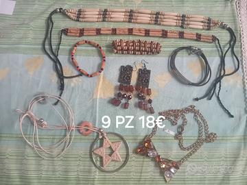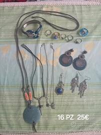 Prezzo per tutto, vendibili anche separatamente, prezzi indicativi in foto. Colore predominante viola, kit composto da 23pz: 5 bracciali, 15pz orecchini, 2 collane corte, 1 collana lunga che può diventare cintura. Colore predominante oro e rosso, kit composto da 16pz: 7 bracciali, 8pz orecchini e 1 collana corta. Colore predominante blu, kit composto da 16pz: 6 anelli, 1 bracciale, 5pz orecchini, 3 collane corte, 1 collana lunga che può diventare cintura. Colore predominante marrone, kit composto da 9pz: 3 bracciali, 2pz orecchini grandi con pietre, 2 collane girocollo, 1 media e 1 lunga.
