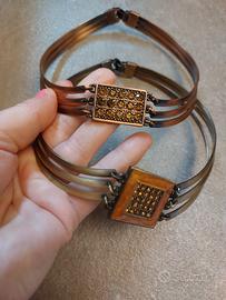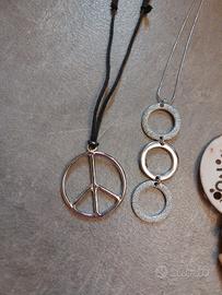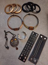 usato, vendo vari pezzi di bigiotteria tra cui 2 collane collarini molto belle una colo rame e una color bronzo, 2 bracciali borchie, 6 bracciali fatti ad anello color oro/ nero, collana con simbolo pace, un paio di orecchini anelli grandi, una catenina per vita fatta a cintura ed altro,