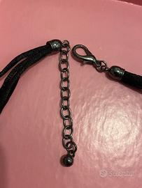 Elegante ciondolo color argento brunito con pietra centrale nera circondata da piccoli brillantini neri. Cordino setoso a 5 fili nero con chiusura a gancio regolabile.
