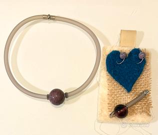 Set di bigiotteria artigianale include una collana girocollo in gomma con pietra centrale , un paio di orecchini coordinati e una spilla con sfera in vetro.