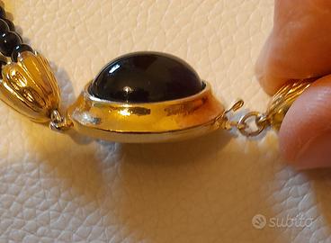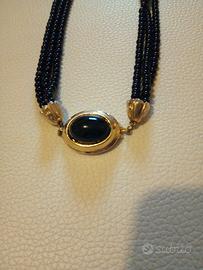 collana girocollo per torchon anni 80' formato da sfere nere con inserite 14 sfere color oro opaco. Lunghezza collana 45 cm. Il fermaglio di 2,5 cm è portabile oltre che sul retro anche sul fianco o davanti.