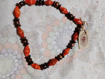 Vendo a € 1 al pezzo bigiotteria in vari materiali in buone condizioni ideali come idee regalo originali dal design elegante adatto ad ogni outfit 1- collana in pietre dure sfacettate di colore verde con chiusura a clips 2- collana in legno con perle sfacettate e di color marrone e arancio 3- bracciale a cordino regolabile con ciondolo in metallo a forma di M impreziosito da cristalli luminosi 4- spilla in metallo dorata lucida a forma di rosa con petali bianchi di stoffa e foglie di metallo plastificato