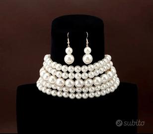 LEGGERE TUTTO IL MIO ANNUNCIO ! VEDI ALTRI MIEI ANNUNCI ! Collana a più fili con perle bianche. Collana multifilo con perle di diverse dimensioni. Chiusura della collana regolabile. Orecchini coordinati inclusi. Set elegante e raffinato. Set perfetto per ogni occasione e soprattutto per cerimonie ed eventi speciali. La collana è di notevole impatto e sebbene di bigiotteria, sembra vera. Set nuovo. Mai indossato. Senza alcun segno di usura.