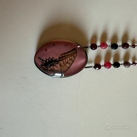 Catena con piccole pietre viola e 8 pietre piu grandi e con pendente in resina : fondo rosa antico con farfalla. Lunghezza catena da chiusura a ciondolo cm 22 , prezzo scontato per mancanza di custodia originale
