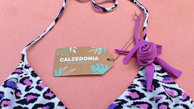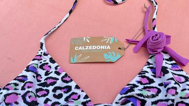 Bikini Calzedonia fantasia con particolare di un bocciolo di rosa applicato al reggiseno ( volendo si puo’ rimuovere),misura 42