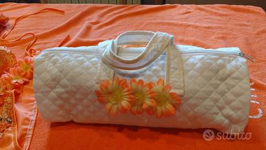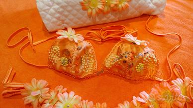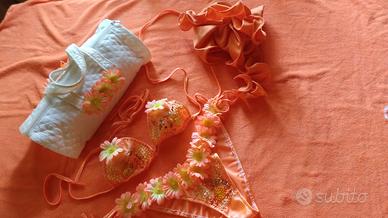 Meraviglioso Bikini nuovo Marca Parah con applicati fiori in tinta, paillettes e perline, taglia 42, abbinato a borsa portatutto in stoffa con applicati gli stessi fiori, elegante e raffinata non solo in spiaggia, ma anche in città.