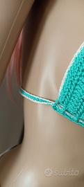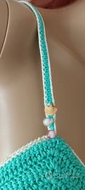 Bikini copricostume composto da reggiseno imbottito e gonnellina con perle.Tutto interamente realizzato a mano è un pezzo unico,veste S la gonnellina,il pezzo sopra S/M