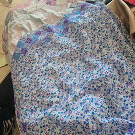 Set bikini da donna con pareo coordinato, caratterizzato da una fantasia patchwork e floreale nei toni del blu e del viola.