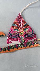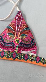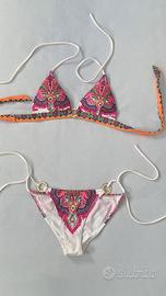 Bikini fantasia fondo bianco, molto luminoso e vivace, anello dorato. No brand, materiale sintetico, taglia XS.