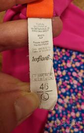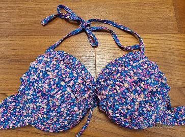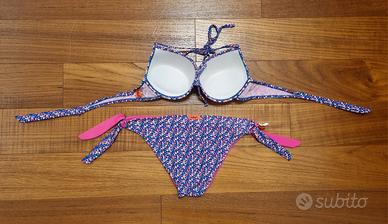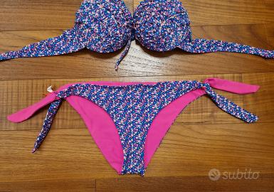 Bikini Infiore con una fantasia floreale vivace. - Top a triangolo con laccetti. - Slip con laccetti laterali regolabili. - Fodera interna a contrasto. - Come nuovo - Taglia 46 sia top che slip