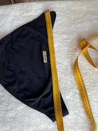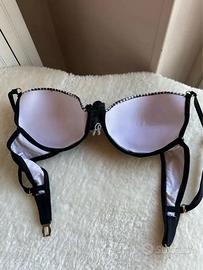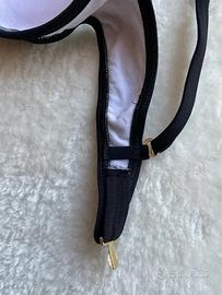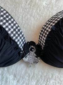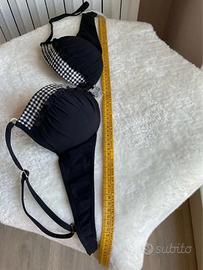 Bellissimo bikini nero. Reggiseno con coppe semi imbottite e fascia a quadretti bianchi e neri. Decorazione centrale. La fascia di chiusura, leggermente ristretta, può essere ripristinata secondo le proprie misure. Slip nero foderato. Tg 48 (veste piccola), foto con misure. Indossato pochissimo. AMAREA