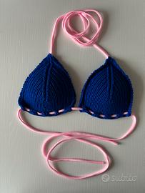 Pezzo sopra di bikini, taglia 2/3, con coppe interne. Colore blu elettrico con nastro in lycra rosa. Fatto a mano, mai usato