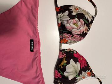 Bikini sundek, taglia 46, slip tinta unita con lacci, sgambatura regolare. Reggiseno a triangolo con fantasia foorale, spalline regilabili.