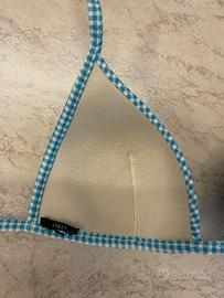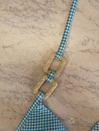 Bikini top a triangolo con fantasia vichy. Il design presenta due anelli quadrati effetto legno. I laccetti sono da annodare sul collo e sulla schiena. Le coppe sono preformate senza imbottitura. Marchio: Cobey.