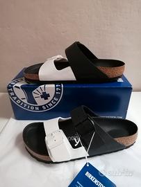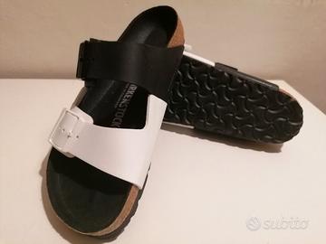 Sandalo a due cinturini modello Arizona nella versione Split bicolore bianco e nero, taglia 38, calzata normale.