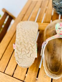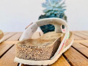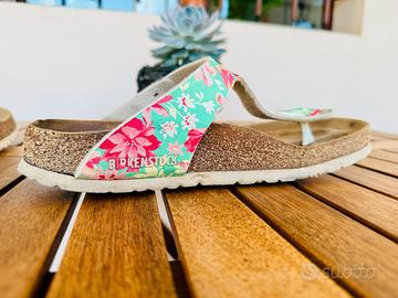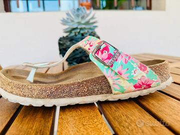 Vendo sandali Birkenstock modello Gizeh, numero 39, con cinturino regolabile e fantasia floreale colorata.