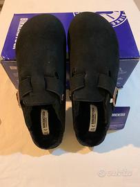 Un paio di sandali Birkenstock Boston in camoscio nero, dal design minimalista e senza tempo.