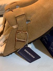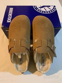 Un paio di sandali Birkenstock Boston in camoscio giallastro, dal design minimalista e senza tempo.