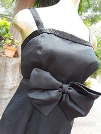 1) Abito sartoriale, tubino nero in lucido rigatino impreziosito da un fitto pavé di tubicini in tinta per l'intera scollatura e bretelle, arricchito da un grande fiocco in organza per risaltare il punto vita (eventualmente staccabile e riapplicabile per cambiare look).