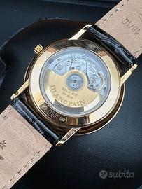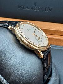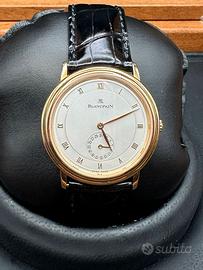 La cassa da 34 mm in oro 18 kt, il quadrante argenté con numeri romani e la complicazione data a lancetta lo rendono un segnatempo unico nella sua categoria. Il movimento automatico Blancpain è dotato di massa oscillante in oro 21 kt, visibile tramite fondello in vetro zaffiro. Cinturino nuovo in alligatore nero con fibbia originale Blancpain. Condizioni eccellenti.
