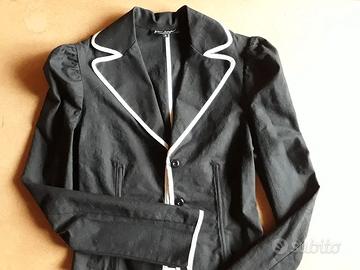 modello a corpino sciancrato con stecche sul davanti e dietro. Maniche lunghe con arricciatura alle spalle e revers profilati di bianco. Tessuto elasticizzato con fantasia di fiori tono su tono. Nuovo, mai indossato.